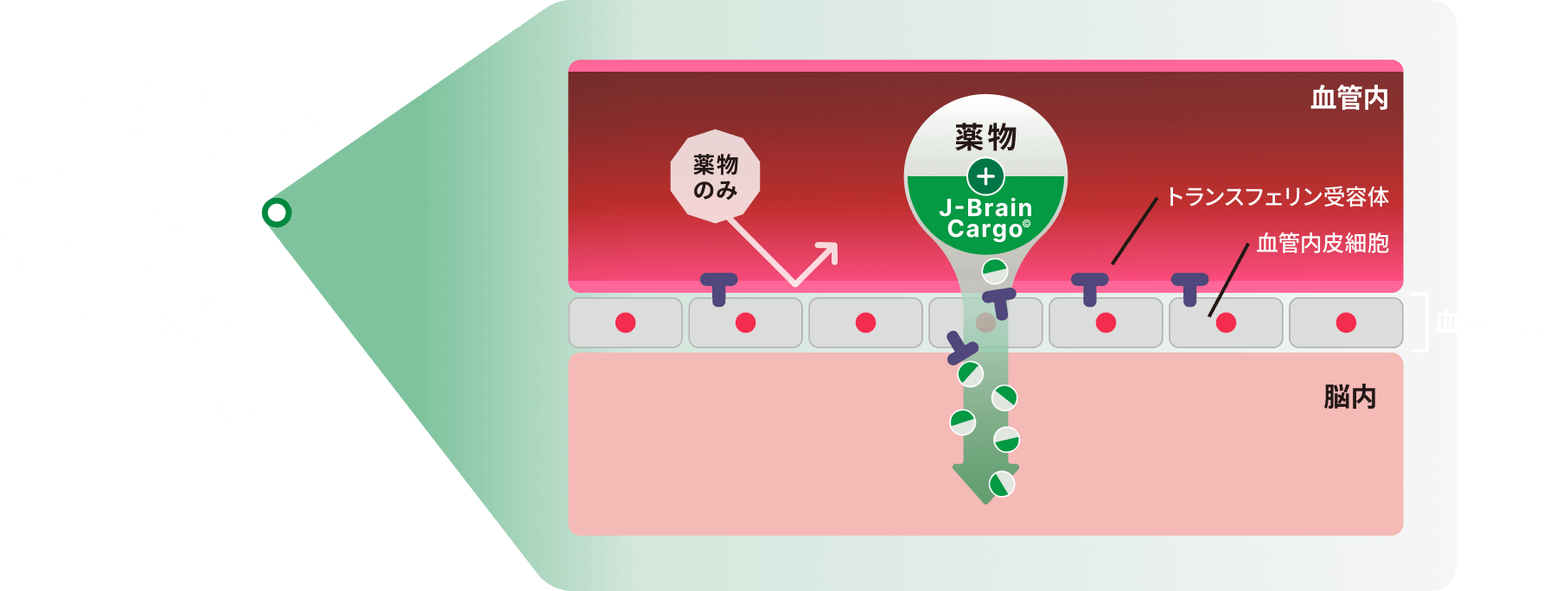 脳は、血液脳関門(blood-brain barrier: BBB)と呼ばれるバリア機構により保護されており、この関門が薬を届ける際の大きな障壁となっています。J-Brain Cargo®とは、JCRファーマが独自に開発した血液脳関門通過技術であり、脳の血管内皮細胞表面に発現するトランスフェリン受容体を利用して、脳および脊髄といった中枢神経系組織への薬の送達を可能とします。