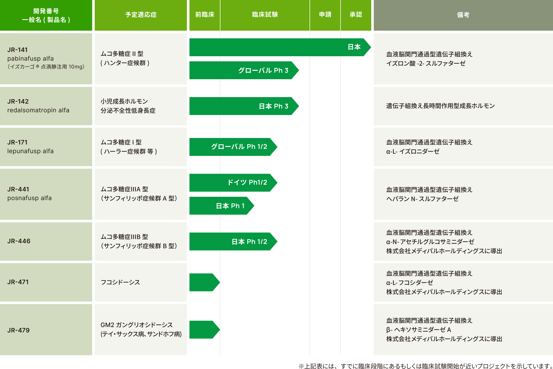 当社は、希少疾病を中心に、患者さんのアンメット・メディカル・ニーズに応える新薬の創出を目指し開発パイプラインを構築・拡充しています。最新の開発状況は以下をご覧ください。