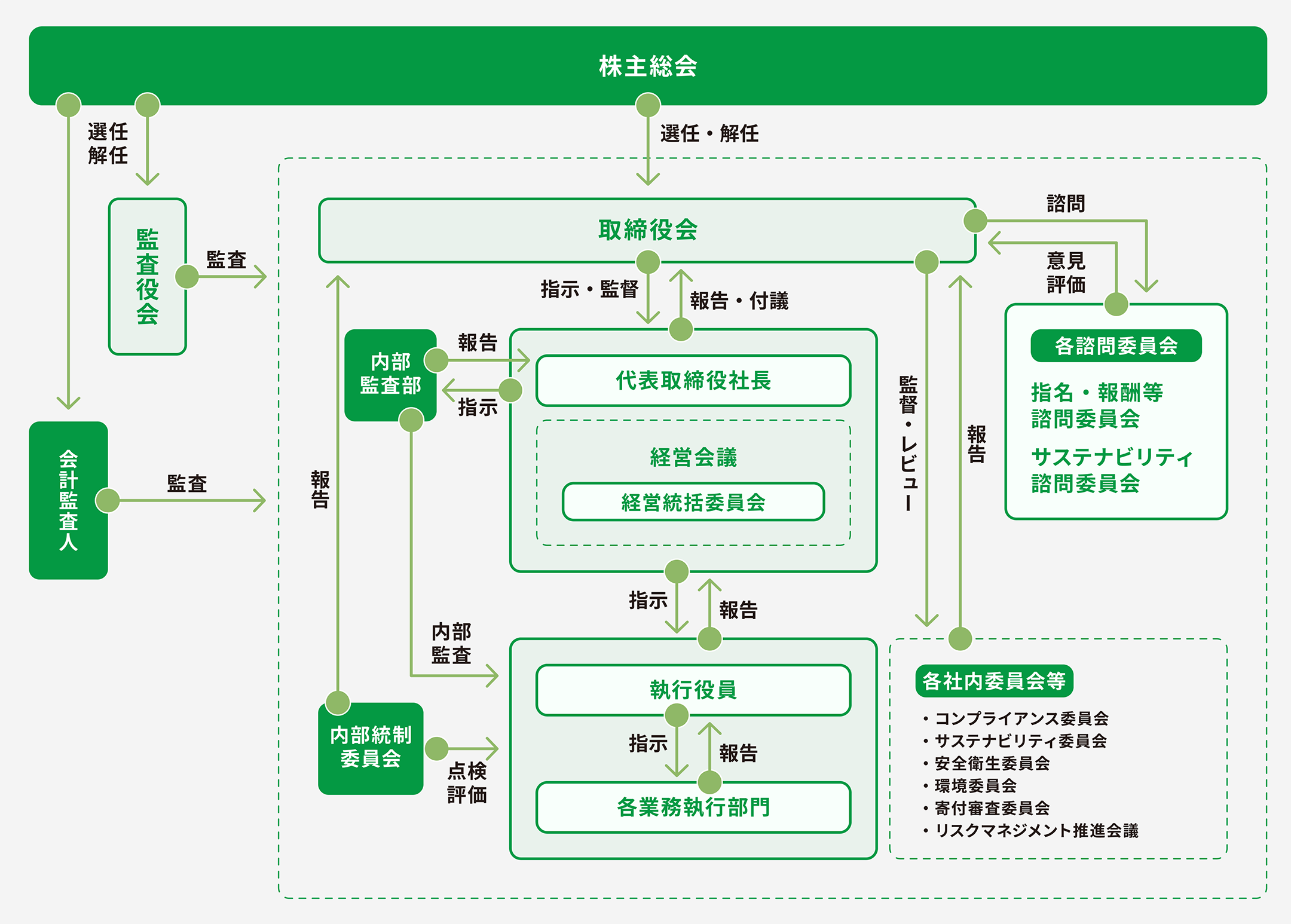 JCRは、監査役会設置会社の形態のもとで、社外取締役6名を含む11名で構成される取締役会、社外監査役3名で構成される監査役会および会計監査人を設置しています。これらの機関のほかに経営統括委員会、指名・報酬等諮問委員会、サステナビリティ諮問委員会、経営会議、内部監査部、内部統制委員会、コンプライアンス委員会、サステナビリティ委員会、安全衛生委員会、環境委員会、寄付審査委員会およびリスクマネジメント推進会議を設置しています。ガバナンスの構成としては、JCRの現状で業態に即した適切な規模であり、効率的な経営が可能と考えています。また、社外取締役6名、社外監査役3名を含んだ現状のガバナンス体制は、経営の透明性、客観性(公平性)および経営監視の独立性確保に有効であると判断しています。